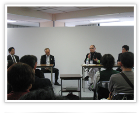 | トークショーは立ち見が出るほどの盛況ぶりでした。出展者、来場者、美術関係者の隔てなく、 貴重なトークに聞き入りました。 | モデレーターは弊社代表の徳光が務めました。テーマに基づいた質問を次々と出演者の方々に 投げかけていきます。 | トークショー終了後、来場者からの質問に答える出演者の方々。質問の意図を理解しようと真剣に耳を傾け、真摯に、正直に(時にはバッサリと)ご回答いただきました。 |