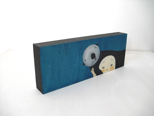 越後しの氏が一貫して追い続けているのは、その時々の自分の心象風景だといいます。念写のようにして日々、彼女の手元から生まれるユニークな「自画像」には、原画か版画かを問わず、詩的な含意の膨らみと民芸品的な可愛らしさがあります。本作は、大好評の置き作品シリーズ。小さいサイズの厚い板にアクリル絵具で丁寧に描き込まれています。
