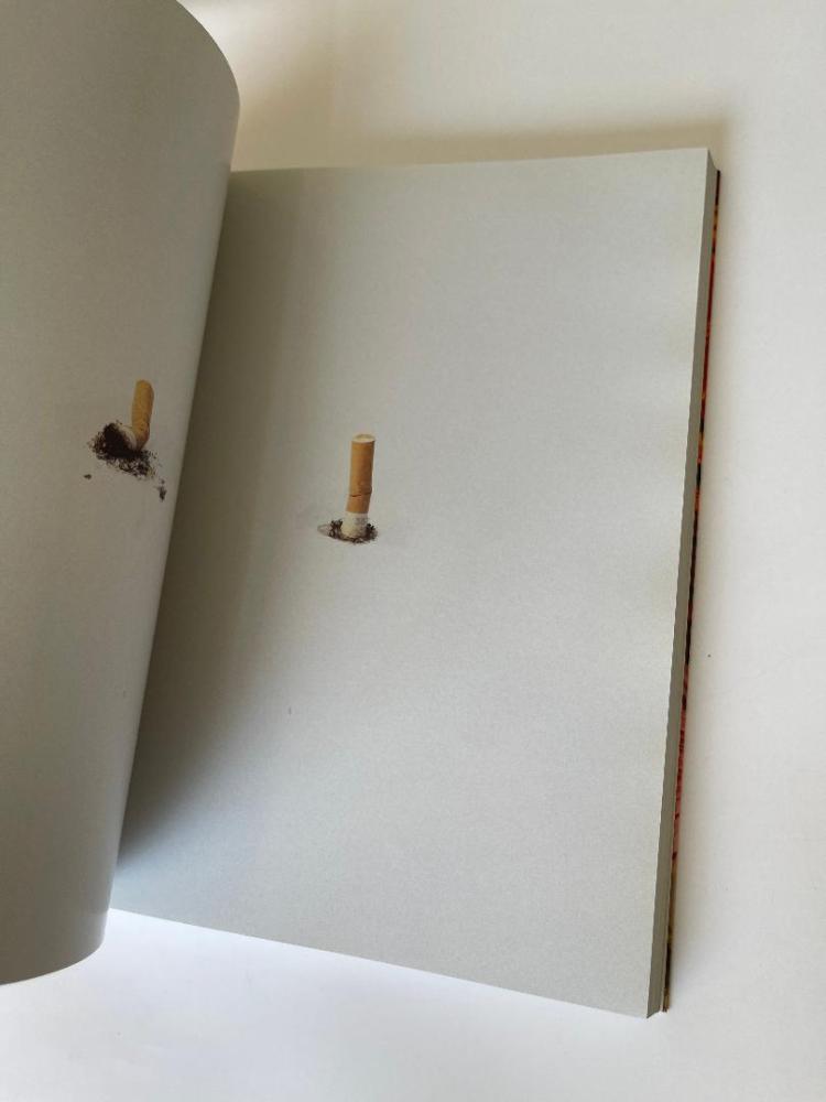限定1000部で、作家自身がナンバリングとサインをした貴重なカタログです。表紙は非常に美しい花ですが、中は永遠とタバコの吸殻の写真になっています。タバコの吸殻は、ハーストが好んで使用する生と死を暗喩しているモチーフです。表紙と中のギャップに驚かされます。