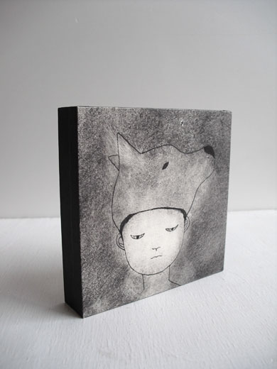 越後しの氏が一貫して追い続けているのは、その時々の自分の心象風景だといいます。念写のようにして日々、彼女の手元から生まれるユニークな「自画像」には、原画か版画かを問わず、詩的な含意の膨らみと民芸品的な可愛らしさがあります。本作は、大好評の置き作品「でばんまち」シリーズの一作です。紙版画の手法で刷り込んだシートを小さく厚い板に水貼りしたもの。かわいらしい存在感です。