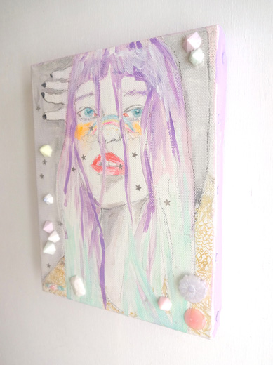 アクリル絵具、鉛筆、ラメグリッター、樹脂パーツ、アンティークボタン