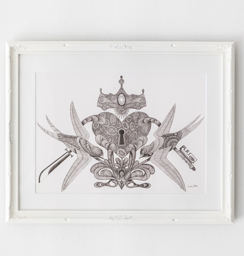 「ColourfulBlack 色とりどりの黒」というベースコンセプトで制作を続けている、yutaokuda氏。ブラックインク一色のみによるペン画でありながら、まるでそこに豊かな彩りがあるかのような洗練された構成美、緻密で「カラフルな」黒づかいが彼の絵の魅力です。生物や花などをおもなモチーフに、ディテールの細かい描画と対をなす気品溢れる空白の余韻も光ります。本作は、初期に描かれた比較的大ぶりなサイズの生物シリーズの一作。額装にまでこだわった作品です。