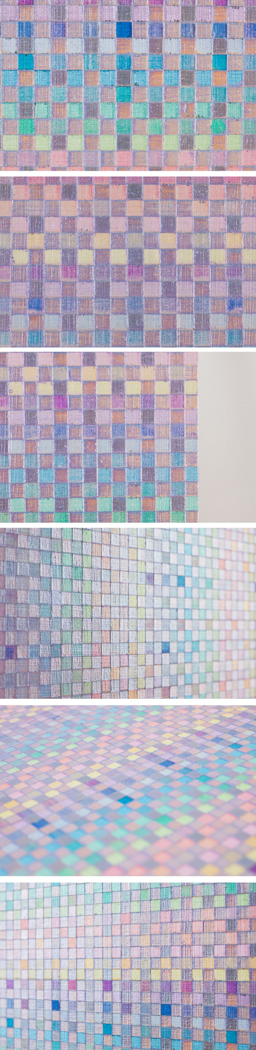 私は、京都で日本の伝統的な染織技法を学んだ後、様々な技法や素材を試すようになり、紆余曲折するなかで、グリッド状の絵画を描くようになりました。このグリッド状の絵画には、染織からの影響が強くみられ、グリッドが織物の組織図を連想させました。伝統的な染織技法においては、いくつもの工程を気が遠くなるような緻密な手作業によって行います。その結果生まれてくる、人間の制御しきれない領域に、人智を超えたとでも言うべき なにか があると感じています。その「制御とズレ」によって生み出される なにか について研究し、制作することが、私のテーマとなりました。グリッド状の単純な形態を描くことは、パソコンで簡単にできるような行為です。しかし、敢えて手を使って描くことによって、その なにか を露呈させることが出来るのではないかと考え、日々制作に励んでいます。