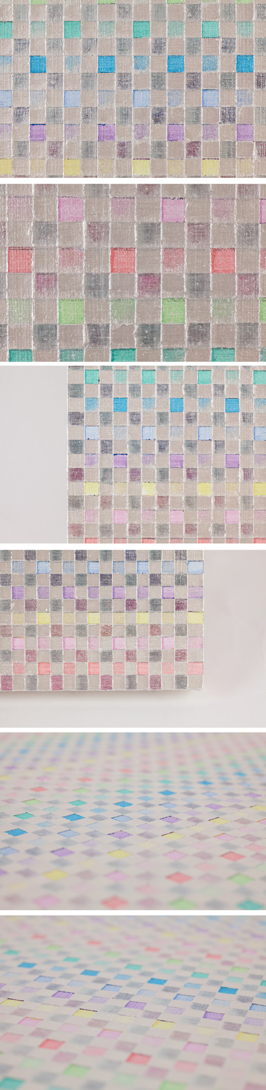 私は、京都で日本の伝統的な染織技法を学んだ後、様々な技法や素材を試すようになり、紆余曲折するなかで、グリッド状の絵画を描くようになりました。このグリッド状の絵画には、染織からの影響が強くみられ、グリッドが織物の組織図を連想させました。伝統的な染織技法においては、いくつもの工程を気が遠くなるような緻密な手作業によって行います。その結果生まれてくる、人間の制御しきれない領域に、人智を超えたとでも言うべき なにか があると感じています。その「制御とズレ」によって生み出される なにか について研究し、制作することが、私のテーマとなりました。グリッド状の単純な形態を描くことは、パソコンで簡単にできるような行為です。しかし、敢えて手を使って描くことによって、その なにか を露呈させることが出来るのではないかと考え、日々制作に励んでいます。