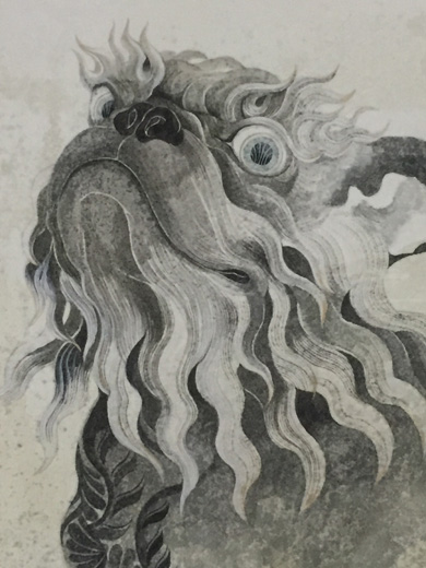 曄田依子氏の「獅子狛」シリーズの一作です。2013年にアメリカ・ポートランドで行われた 二人展、曄田依子×谷口朋栄「Stunning Beauty」Compound Galleryにて展示された作品です。 「現代の人間を描写したいと思った時、私は人を描くのではなく犬を描こうと決めた。人の歴史と同じだけ犬の歴史がある。先祖が生んだ狛犬と、現代人が造った愛玩犬。これらのねじれを縒り集め、現代に適応した獅子狛を描く。」(曄田氏のステイトメントより)
