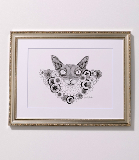 「ColourfulBlack 色とりどりの黒」というベースコンセプトで制作を続けている、yutaokuda氏。ブラックインク一色のみによるペン画でありながら、まるでそこに豊かな彩りがあるかのような洗練された構成美、緻密で「カラフルな」黒づかいが彼の絵の魅力です。生物や花などをおもなモチーフに、ディテールの細かい描画と対をなす気品溢れる空白の余韻も光ります。本作は、A4サイズ大の生物シリーズの一作。額装にまでこだわった作品です。