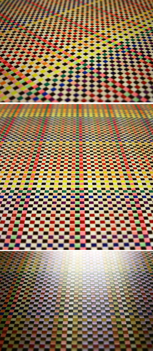 川人の制作方法は、初めに5mm幅のマスキングテープを使って、木製パネルを覆い、それをグリッド状にカットするというものです。そして、いくつかのパーツを剥がし、アクリル絵具で色を乗せ、残りのパーツを剥がします。この一連の行為を何度も繰り返し、鑑賞者が普段、認識している世界に疑いを抱き、感知できる領域を超えた領域を感じることができると判断した時、川人は手を止めます。