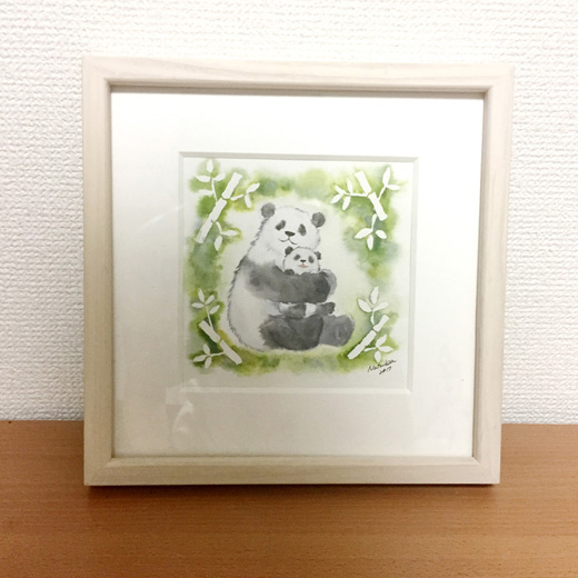 おもに森の生き物を題材にファンタジックな水彩画を発表し続けている村田なつか氏。童話本や絵本のワンシーンを思わせる場面構想力は、透明水彩の独特な滲みとマスキング技法とを駆使することで、より洗練された境地に達しています。動物イラストレーションの王道を承けつつ、自然の陰りや発光感まで豊かに表現できる余白の巧みな使い方が印象的。可愛らしいだけではなく、鉱石や食べ物と動物との組み合わせも試みるなど、グラフィカルでシュールな着想の面白さにも特徴があります。本作は、パンダを題材に描き下ろした最新3連作のなかの1作です。