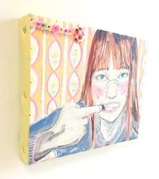 チャーミングで多幸感溢れるカラーリングを軸に、時には小物やお菓子なども素材に選びながら、甘さだけではないオリジナルなエッジの強さが人気の東ちなつの作品。本作は「コンプレックスを持つ女の子」をテーマに、彼女自身が制作する樹脂パーツ、アンティークカボションなど異素材がコラージュされた作品です。