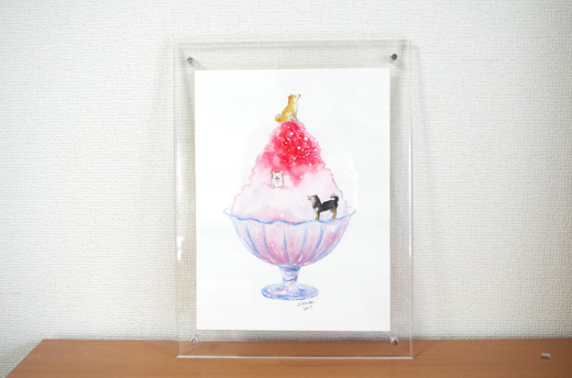 おもに森の生き物を題材にファンタジックな水彩画を発表し続けている村田なつか氏。童話本や絵本のワンシーンを思わせる場面構想力は、透明水彩の独特な滲みとマスキング技法とを駆使することで、より洗練された境地に達しています。動物イラストレーションの王道を承けつつ、自然の陰りや発光感まで豊かに表現できる余白の巧みな使い方が印象的。可愛らしいだけではなく、鉱石や食べ物と動物との組み合わせも試みるなど、グラフィカルでシュールな着想の面白さにも特徴があります。本作は、しばいぬとおやつシリーズからの1点。個展「しばいぬとおやつ」(2017年、新宿・マルイアネックスFEWMANY)で展示されました。