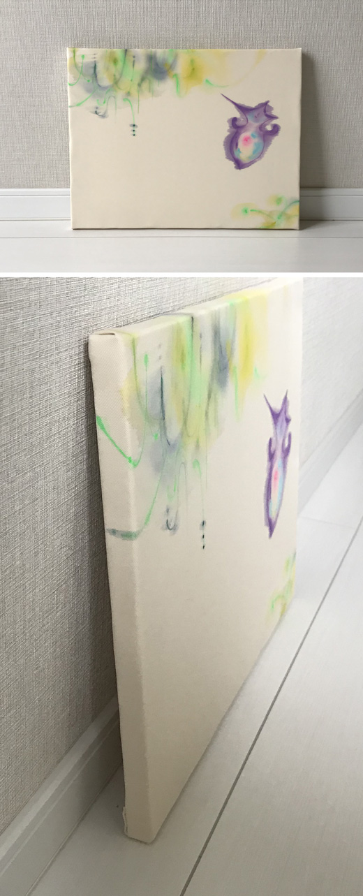支持体の布は自ら調達、筆を使いながら瞬発的に制作することで、鮮やかな滲みを生み出し、広がりのある世界を表現している。そのテーマは「香水を嗅いだ時の感覚」や「味覚」など感覚にまつわるものが中心だ。