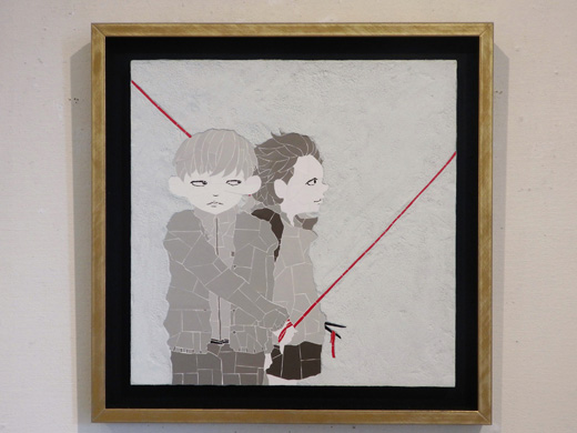 色とりどりのタイルピースを造形し貼り合わせて絵を構成する、ユニークなタイルモザイク手法で創作を続けている落合香木(かなぎ)氏。つややかな素材質感をいかしながら、タイルを自在にマトリクス化して童話のワンシーンのように温かみのある描画を創出。おもに少年や少女の感受性の世界へ、自己の内面を投影しながら表現しています。室内装飾にぴたりとマッチする絵として、おすすめです。本作は、「真逆の過程を経た同一の結果」をテーマに制作されたもの。個展「白い午後」(2018年、仙台・SARP)にて展示されました。