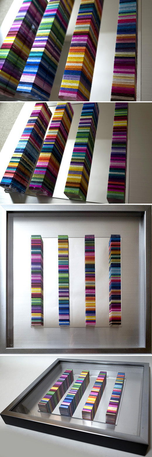 切ったアクリル棒に刺繍糸を巻きつけたものをアクリルミラー板に貼り合わせたもの