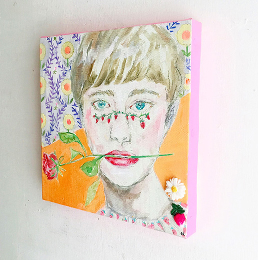チャーミングで多幸感溢れるカラーリングを軸に、時には小物やお菓子なども素材に選びながら、甘さだけではない独特のエッジな強さが人気の東ちなつの作品。 本作は2018年の個展「ぼんぼり糖の日々」で展示されました。自身が制作する樹脂パーツ、アンティークカボションなど異素材がコラージュされた作品です。