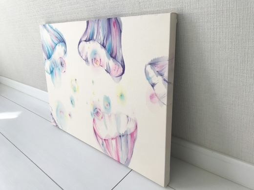 支持体の布は自ら調達、筆を使いながら瞬発的に制作することで、鮮やかな滲みを生み出し、広がりのある世界を表現している。そのテーマは「香水を嗅いだ時の感覚」や「味覚」など感覚にまつわるものが中心だ。