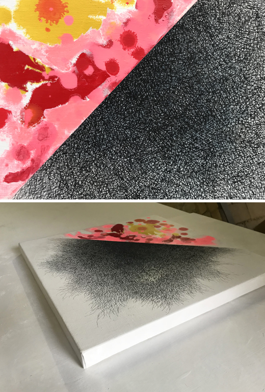 「境界線としての線」は「線そのものも空間に過ぎない」のではないか。 空間の象徴としての木炭の細い線は、蜘蛛の巣状に画面を覆い無限に広がりゆく。 そして何層にも重ねられた不定形な形の色彩は空間の奥行、広がりを感じさせ無限性を表現。 誰もやっていない“オリジナルであること”を追及した木炭の線と油彩の色面による抽象作品。