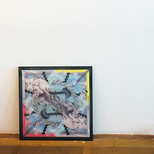 2019年の個展「犬の系図」にて好評を博した曄田氏のオリジナルスカーフをインテリア感覚で額装したものです。隣り合う生と死をテーマに、注連縄と絞首紐、狛犬の髑髏と吉祥モチーフを配した絵柄になっています。 「現代の人間を描写したいと思った時、私は人を描くのではなく犬を描こうと決めた。人の歴史と同じだけ犬の歴史がある。先祖が生んだ狛犬と、現代人が造った愛玩犬。これらのねじれを縒り集め、現代に適応した獅子狛を描く。」(曄田氏のステイトメントより)