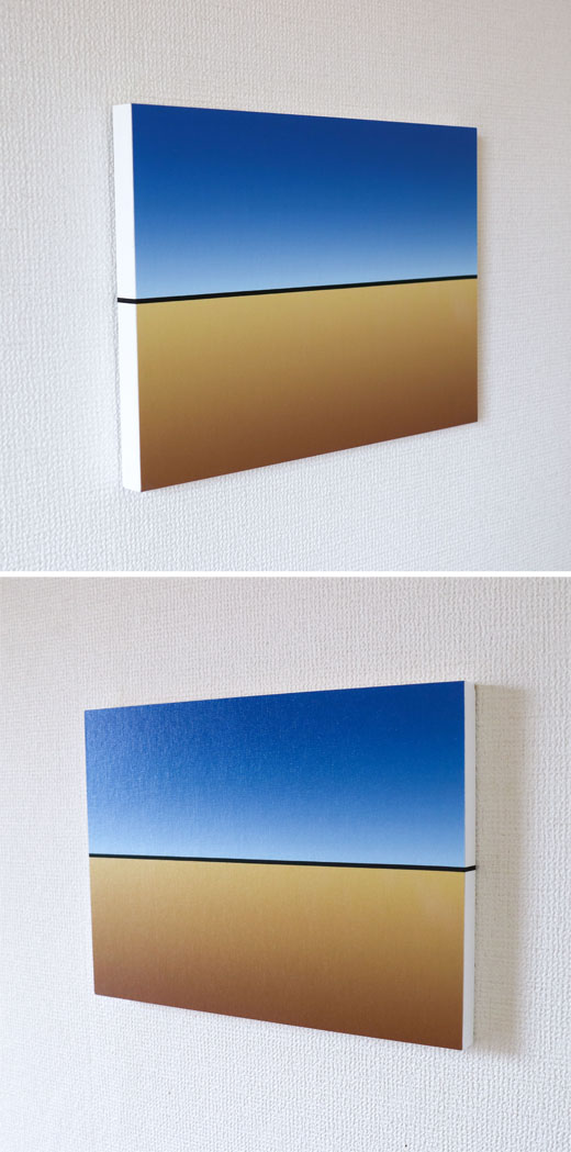 「妨げのない世界」、または眼前から全てのものを取り払うことで見える世界、それは旧約聖書で「はじめに神は天と地とを創造された」と記された、もっともプリミティブな原風景でしょう。そこに現れるのは、天と地を隔てる1本のボーダーライン(地平線)である、という概念を構築し、自分なりの涅槃のイメージ化を試みました。