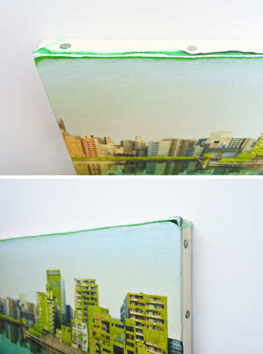 写真を和紙にプリントし、その上に油絵の具で描きたしています