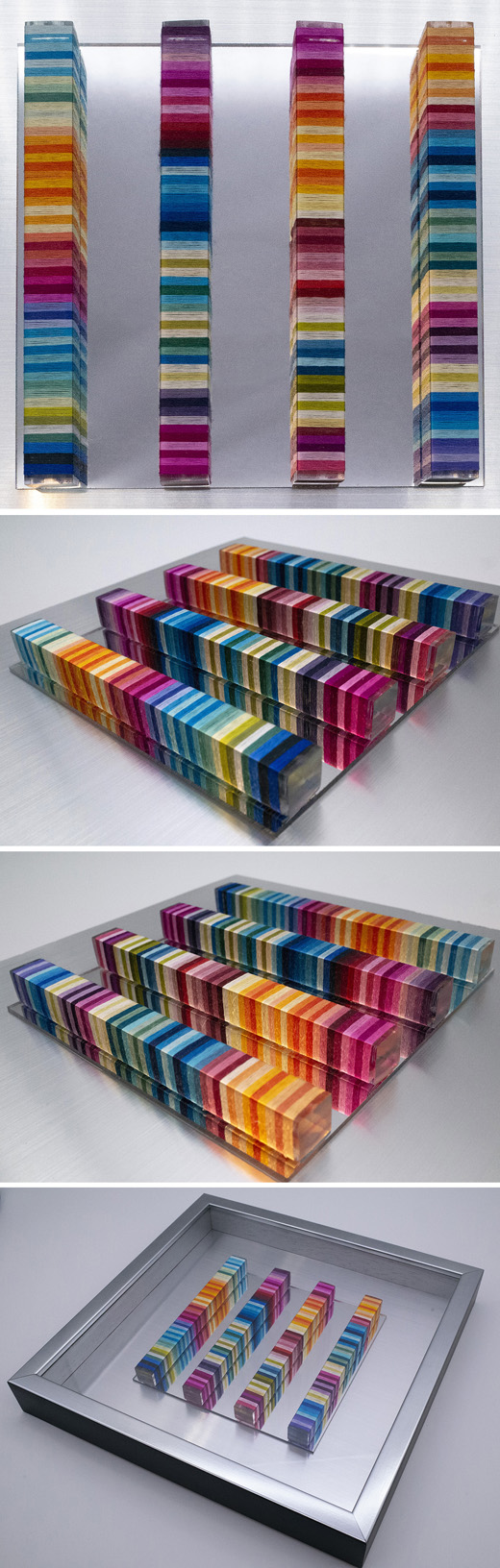 切ったアクリル棒に刺繍糸を巻きつけたものをアクリルミラー板に貼り合わせたもの
