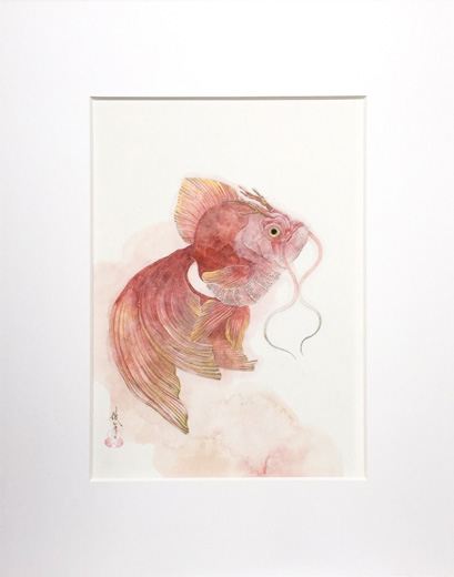 曄田依子氏の「Metamorphose」シリーズの一作です。個展「侍る者」(2014年、大阪・DMO ARTS)にて展示されました。 古代中国、鯉は滝を登って龍と化すという言い伝えがある。果たして、化けて大成するのは鯉ばかりだろうか? 鯉に生まれなかった池の者たちは何にも成れないのだろうか?」(曄田氏のステイトメントより)
