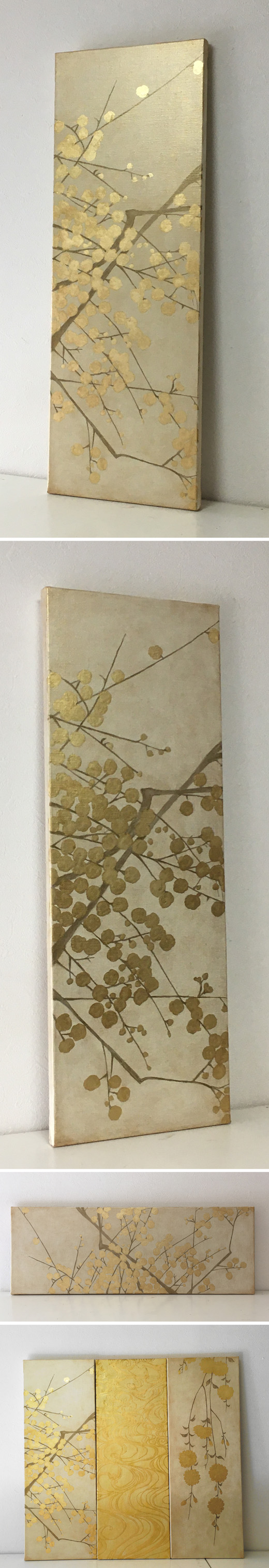 キャンバスに金色の箔と油彩で梅の絵を描きました。桜70、波と一緒に並べて飾ることが出来ます。