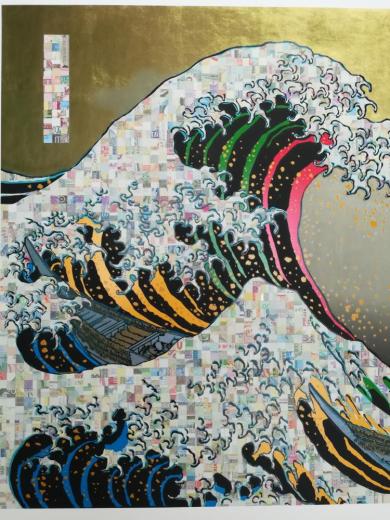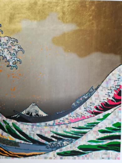 同構図でカラーバージョンが多数作られる浮世絵の引用と、紙幣がランダムにコラージュされたAutomaticPaintingにより全てユニークピース。引用 葛飾北斎『神奈川沖浪裏』