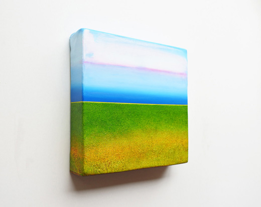 Landscape series ; 地平線に向かいどこまでも続く、丁寧に描かれた鮮やかな大地と空は、誰もが想像し得る特別な原風景。 世界を構成する大きな要素をソリッドに表現することは、混沌とした日常を浄化する作業でもあり、作品制作における大切なファクターの一部でもある。 人の心の中に遺されてく原風景のようにキャンバスにセカイを描き続けたい。