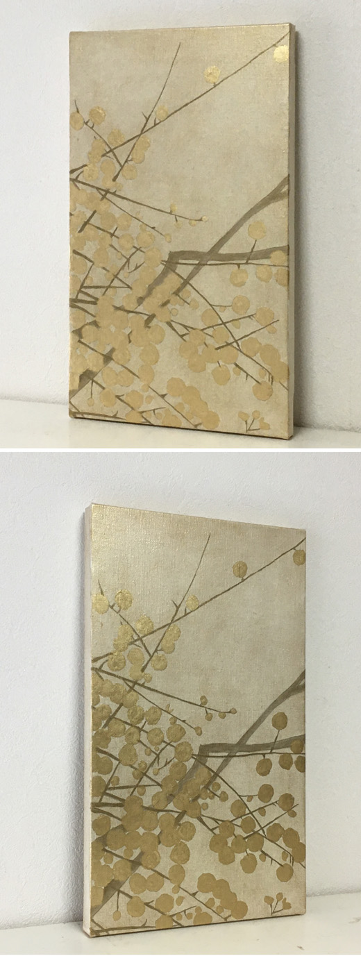 キャンバスに金色の箔と油彩で梅の木を描きました。
