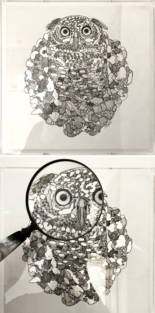 モチーフのほとんどは生きものたち。「beautiful foodchain」をコンセプトに自然の摂理の美しさを描いています。表現手法はここ数年で、線のみの計算された細密画から、墨の滲みという偶然性も援用するアプローチへと展開してきました。
