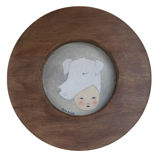 越後しの氏が一貫して追い続けているのは、その時々の自分の心象風景だといいます。念写のようにして日々、彼女の手元から生まれるユニークな「自画像」には、原画か版画かを問わず、詩的な含意の膨らみと民芸品的な可愛らしさがあります。本作は、越後氏自薦の新作。こだわって製作された円形額に、アクリル絵具による丸い原画が封印されています。