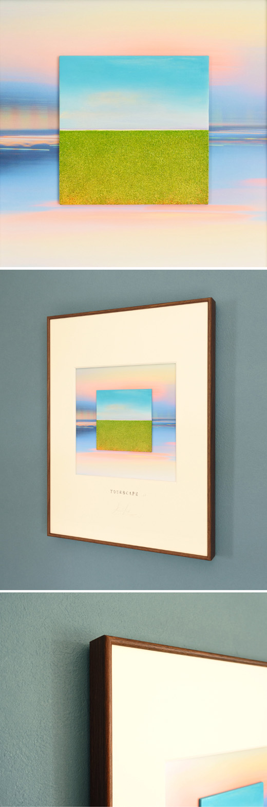 landscapeシリーズ:油彩と写真を組み合わせています。その一瞬にだけ見せる風景の表情を、正方形というある種完璧な形の中に閉じ込める。変わりゆく風景の中にも静かでゆるぎない美しさを表現している。