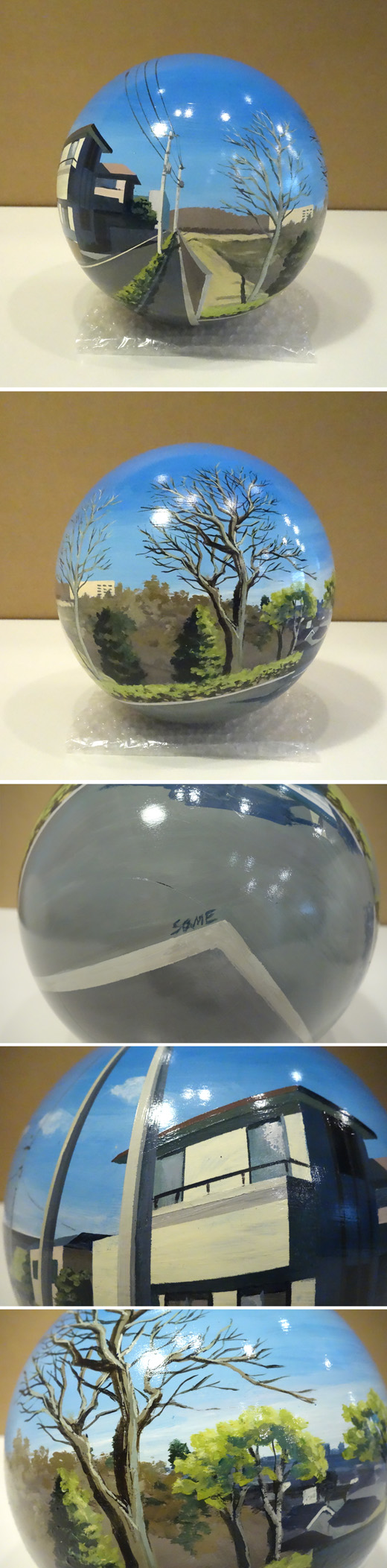 Daisuke Samejima paints common views such as street, residential area and park on globes echoing the earth. The views are presented without emotion. Even though city policies built them, they are devoid of character, enabling him to create these works.