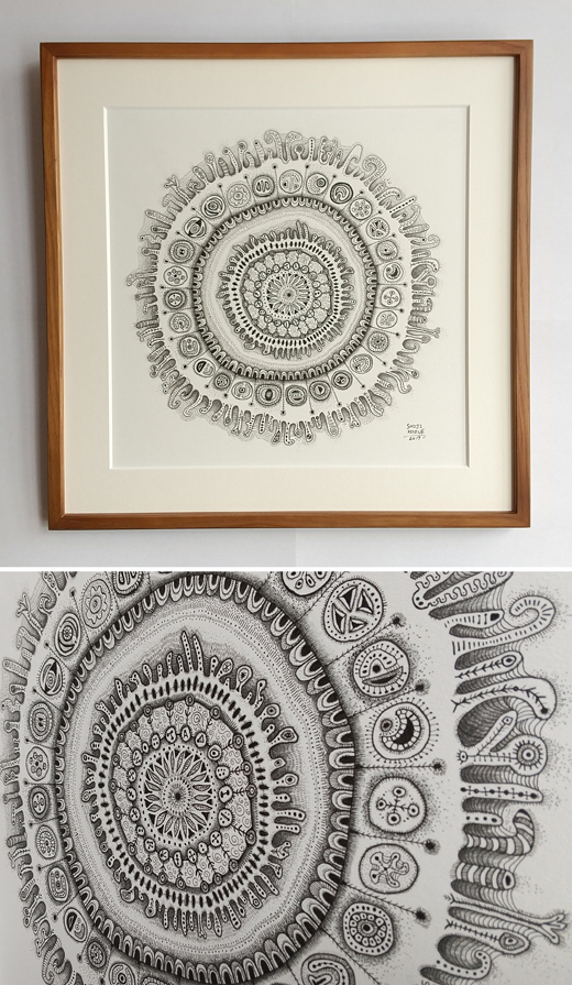 本作は、愛する自然や生き物たちからインスピレーションを受けた”神様シリーズ”からのペン画の一作です。モノトーンなのに極彩色を想起させるほどスケール感豊か。宇宙をも感じさせる画想が見飽きない魅力となっています。個展「わたしのいのちをあなたへ」(2019年、六本木・Hideharu Fukasaku gallery)にて展示され好評を博しました。