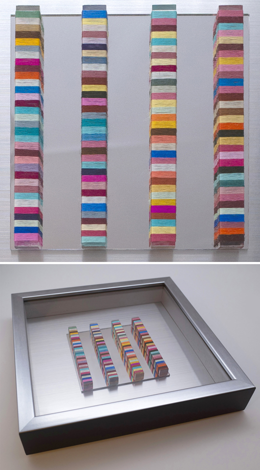 切ったアクリル棒に刺繍糸を巻きつけたものをアクリルミラー板に貼り合わせたもの