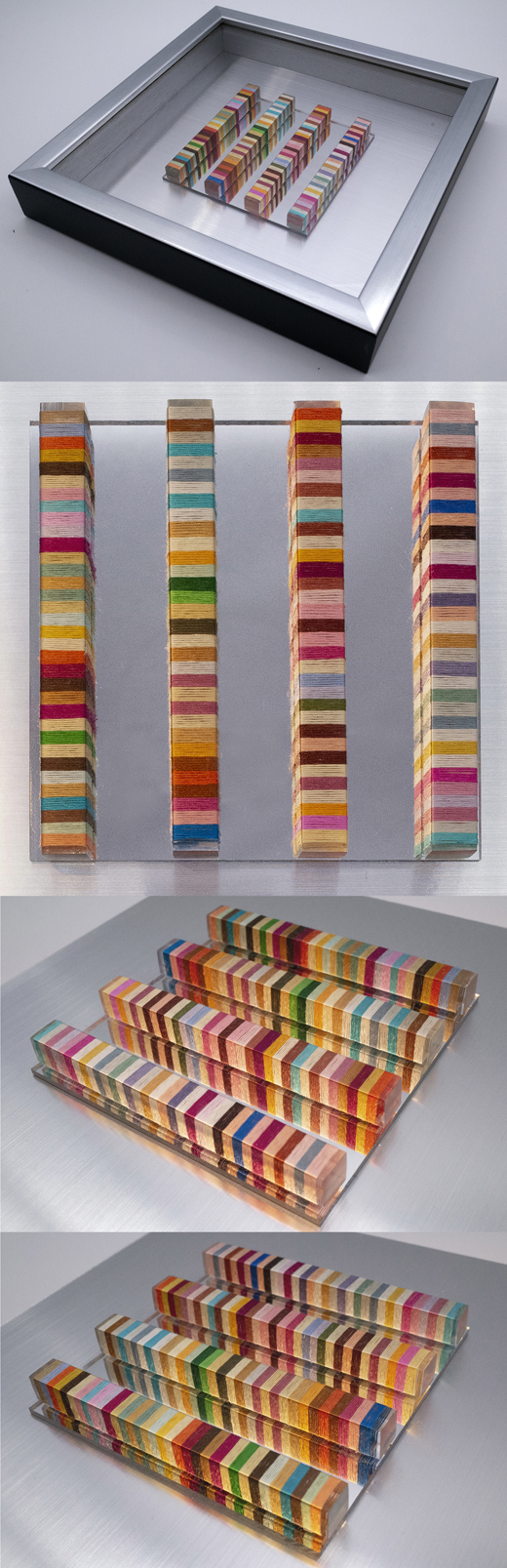切ったアクリル棒に刺繍糸を巻きつけたものをアクリルミラー板に貼り合わせたもの
