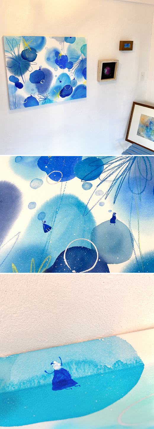 本作は、水彩特有のぼかしやにじみの可能性を探るシリーズからの一作です。たくさんの青の絵具を眺めていると、それぞれの青に感情があり世界があるように見え、その雰囲気を描いたという一枚。個展「tsumuguen」(2020年、葉山町・porto ponpone)で展示されました。
