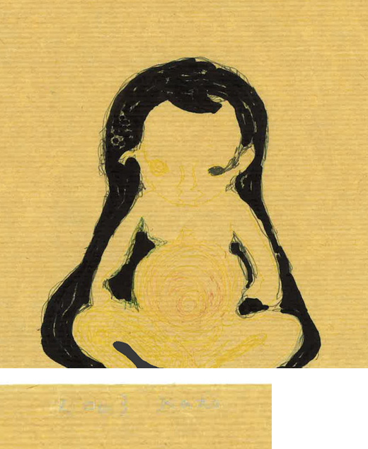 Kato’s paintings and sculptures feature ‘primitive’ looking creatures that resemble babies or creatures floating in amniotic fluid, stripped of nationality, race, and age.