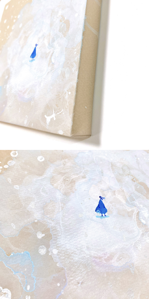 水彩絵具を微妙なバランスで混交させ走るU-ku氏独特の筆づかい。それがふんわりと滑ってゆくとき紙上は平らな物質を超え、「心の世界」についてのテーマパークへと一変します。何をモチーフにしているのか明確に表してはいないにもかかわらず、淡い色調を明暗巧みに操りつつ、にじみやカスレ、勢いの抑揚などひとつずつの塗りにフェティシズムを宿すような画面づくりが印象的。余白は宇宙にも通じそうな奥行きをたたえ、絵に小さく隠しこまれた女性や生き物が彼女自身の心象風景へのナビゲーターを演じることで、絵にドラマティックなスケール感を与えながら見るものを包みこむのです。