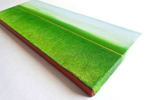 Kumiko Tamura's paintings are done on square canvasses with depths of 7-10 cm, with a picture composition wherein scenes of city or nature are split in two parts by the horizon.