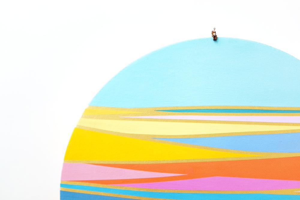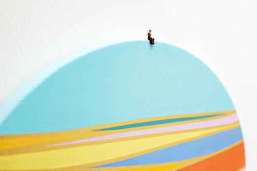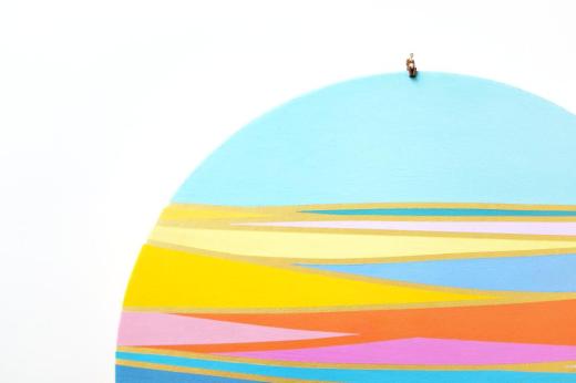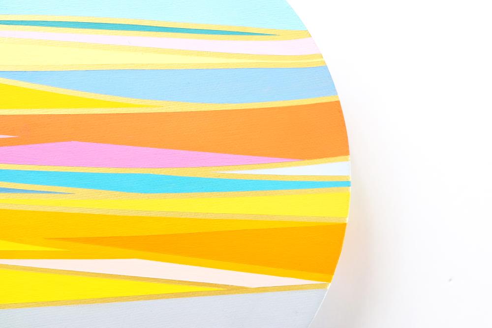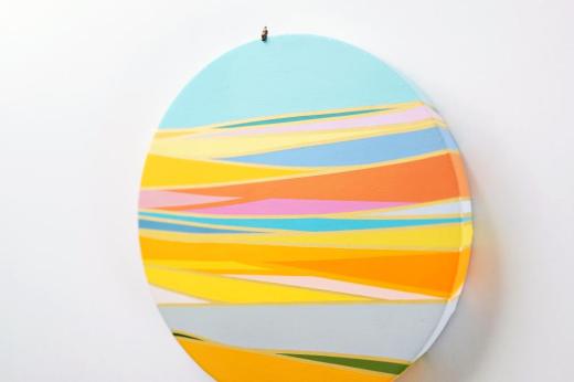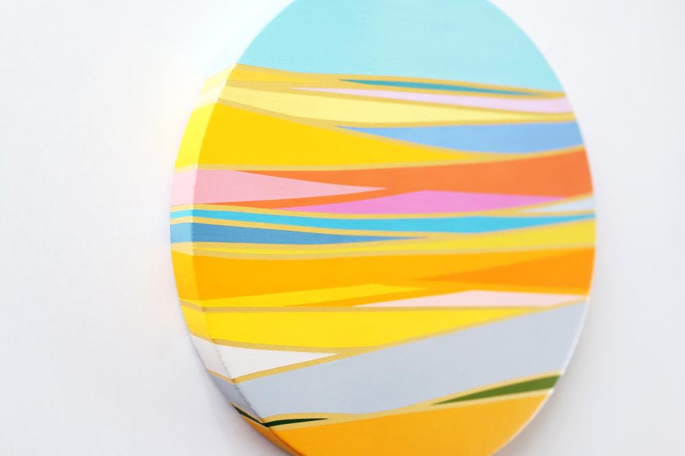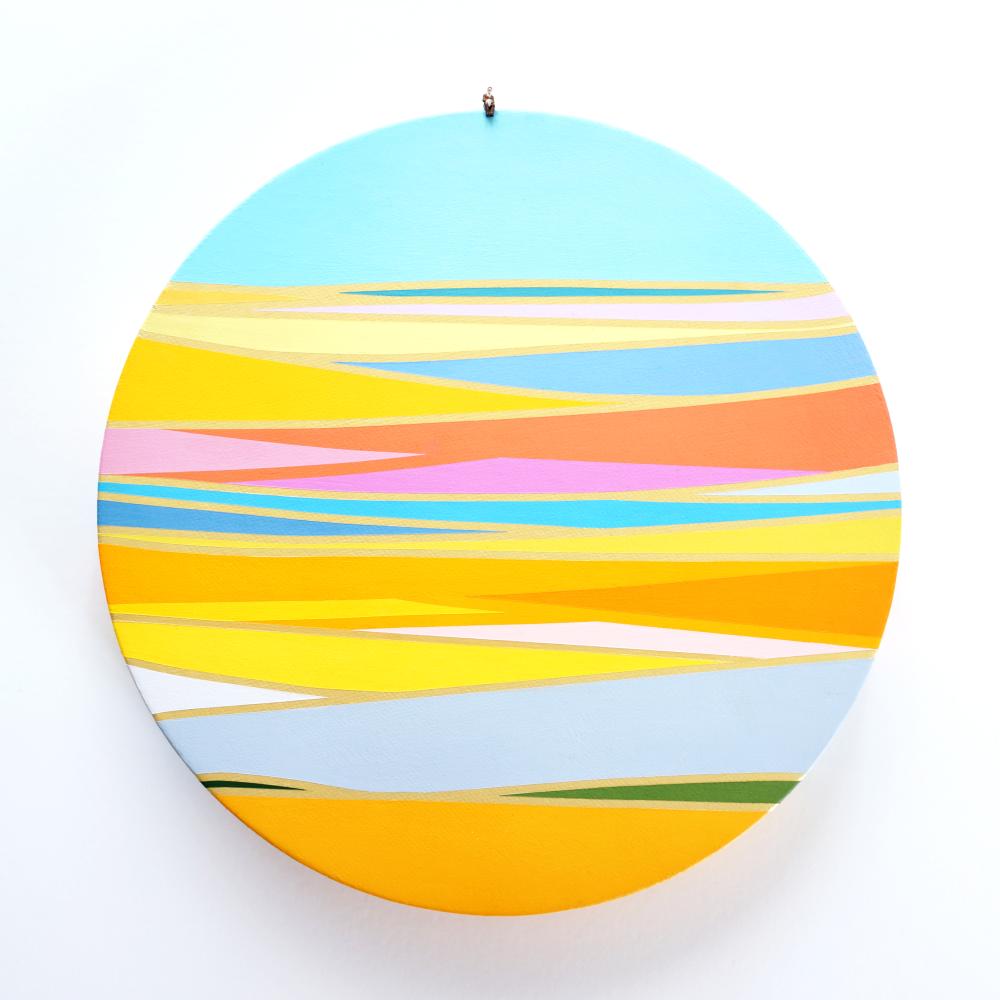 「風景」をテーマにした新シリーズ。 その土地の色、匂いなど、山々や樹々がつくりだす特有の形によって風景の輪郭がつくられる。私たちを広く包み込み感情を揺らす自然の風景を、緩やかな曲線を重ねながらキャンバスの中に描きだした作品。 「彼は誰れ時(あれはだれどき)」:時を表す大和言葉/夕暮れのこと
