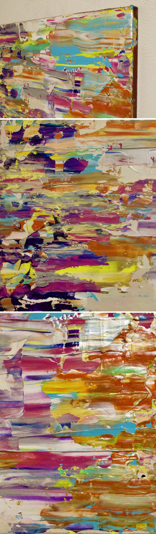 絵の具の色気を意識した層を丹念に重ねていく。粘度が強く、贅沢に顔料が込められた発色がピュアなアクリル絵の具を惜しみなく。