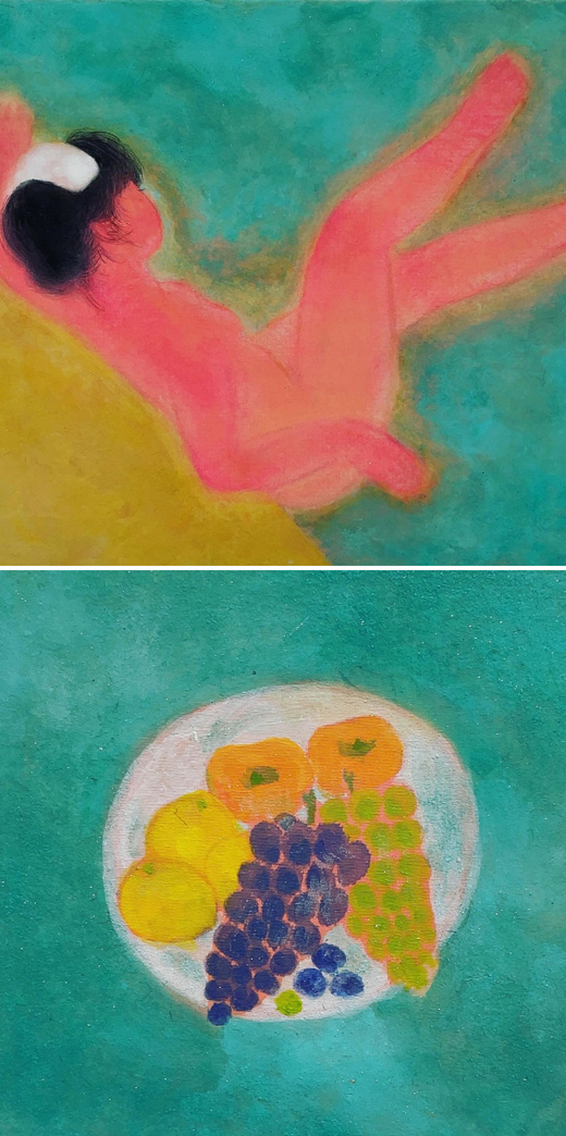 岩絵の具、珊瑚、アクリル、絹、パネル