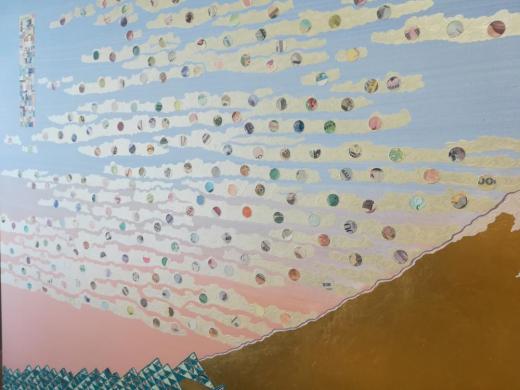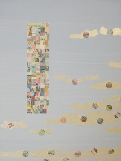雲は世界100カ国紙幣を使いグローバルマネーの浮世を、富士はマルコポーロによって世界に伝播した黄金王国ZIPANGを金箔に重ね、麓は$紙幣でコラージュ、現代日本を表現。