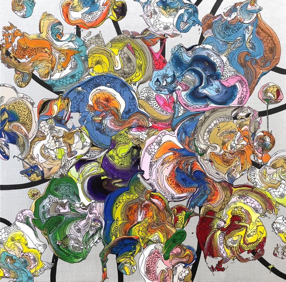 絵の具の混ざった偶発的な部分を、極細のペンでアウトライン化していくことで『偶然』を『必然』変えていくような描き方をしている。