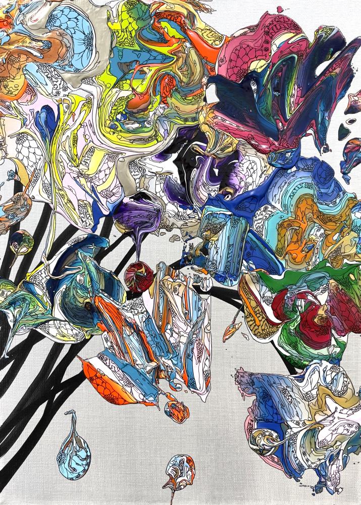 絵の具の混ざった偶発的な部分を、極細のペンでアウトライン化していくことで『偶然』を『必然』変えていくような描き方をしている。