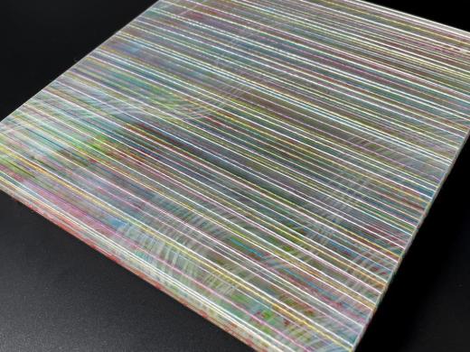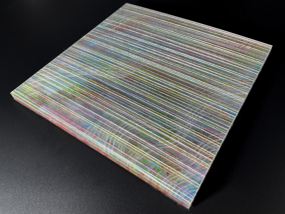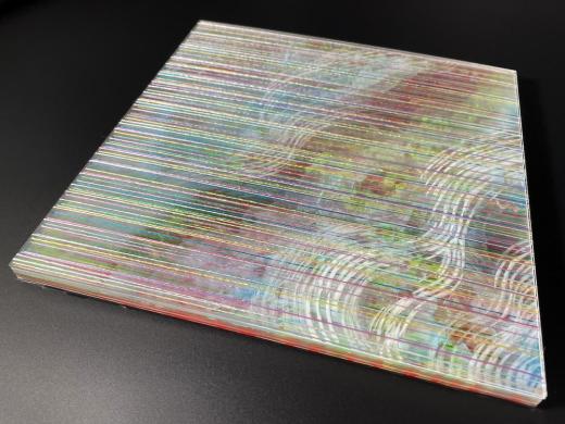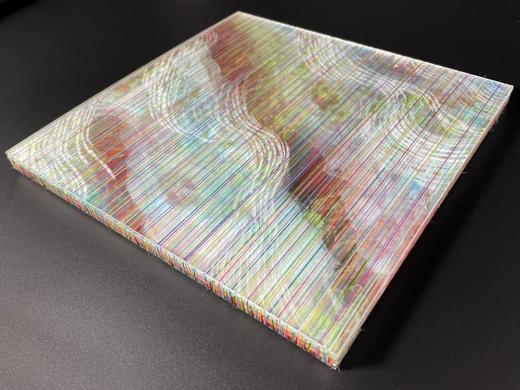 I created this series to preserve my fear of losing my memory and the realizations I have gained from losing my cat. The work is made up of layers of painted transparent acrylic boards and spools of silk embroidery thread. What is painted on the bottom layer is definitely there, but the countless threads block the view, so that we can only see it vaguely.