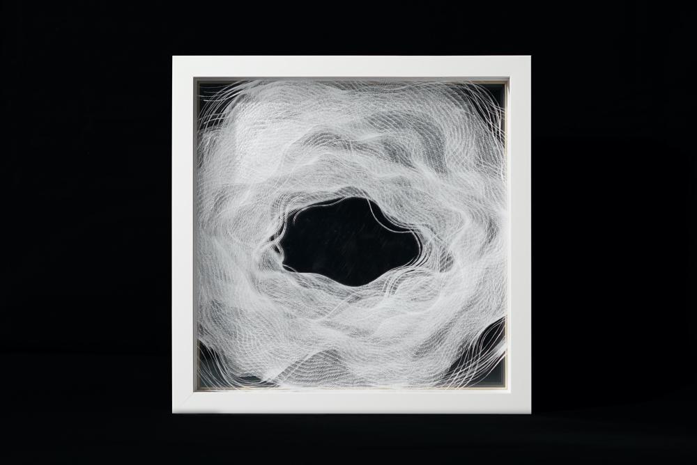 透明なアクリルの板に浮かび上がる精緻な模様、細やかな点と線の集まり、