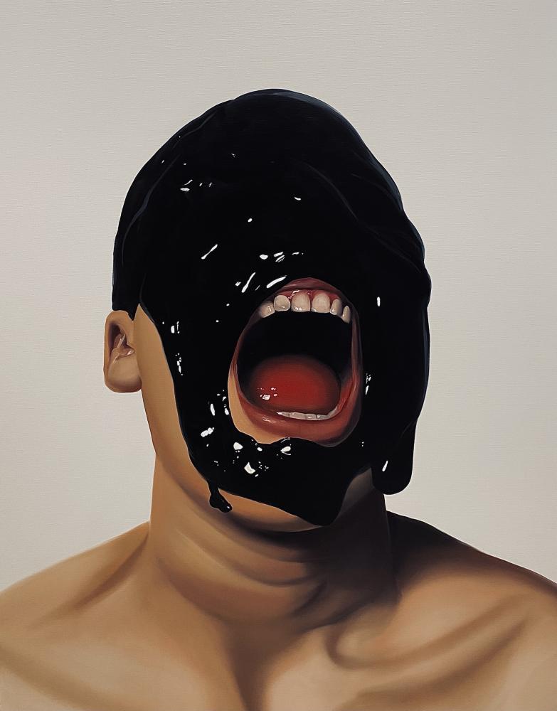 スライム状の物質と有機的なモチーフを組み合わせた独特な人物画は、質感や透け感、柔らかさが写実的に描かれ、一度見たら忘れられないインパクトを残す。