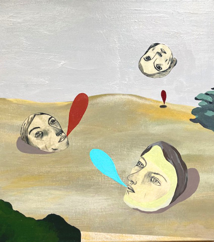 「顔」をテーマにしたシリーズ。コロナ禍で実際に人と会う機会が薄れ、発した言葉だけが受け取る良い相手もいないまま行き場を失って彷徨っている様をイメージした作品。